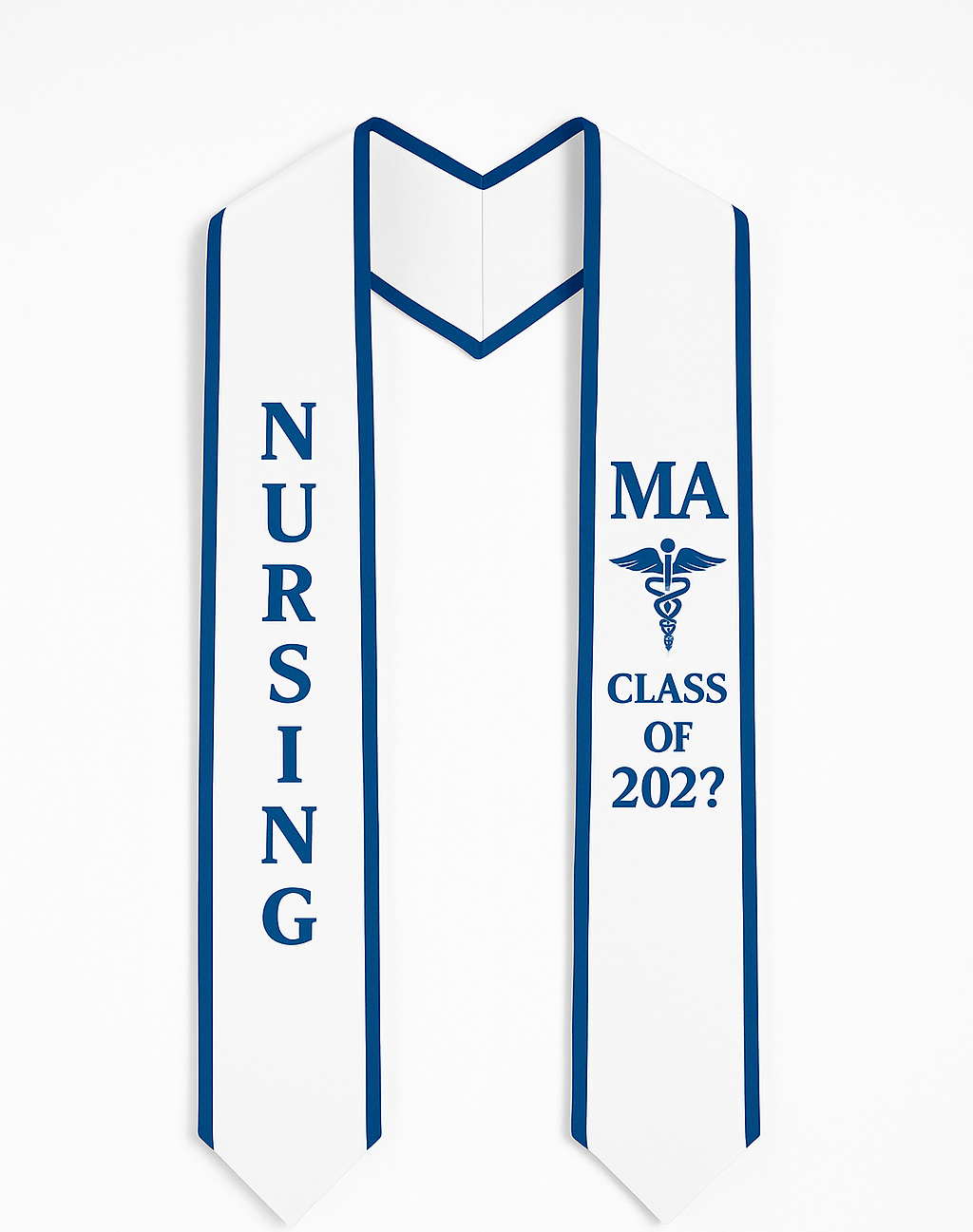 Celebrate your achievement in the medical field with this elegant MA Graduation Stole, the perfect keepsake for Medical Assistant Graduates. Shown in White with Royal Blue trim, this stole features premium satin fabric, professional embroidery, and your choice of Pointed V-Tips or Angled Ends for a polished, modern look. The left panel displays NURSING vertically, while the right panel includes MA, the caduceus emblem, and CLASS OF 202? — making it ideal for your Commencement Ceremony, Pinning, or Graduation Photos. Whether you refer to it as a Grad Stole or Grad Sash, each piece is carefully crafted to highlight your program pride and dedication to healthcare excellence. Designed to drape beautifully over your gown, this stole perfectly captures the honor and professionalism of becoming a Medical Assistant.Style: Pointed V-Tips or Angled Ends with trim along the long sides and neck area only.